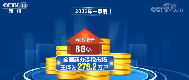 国家税务总局数据显示,2021年一季度,全国新办涉税市场主体为279.2万户,同比增长86%,比2019年同期增长34.9%,两年平均增长16.1%。其中,2021年一季度新增个体工商户同比增长101%,比2019年同期增长36%,两年平均增长16.6%。