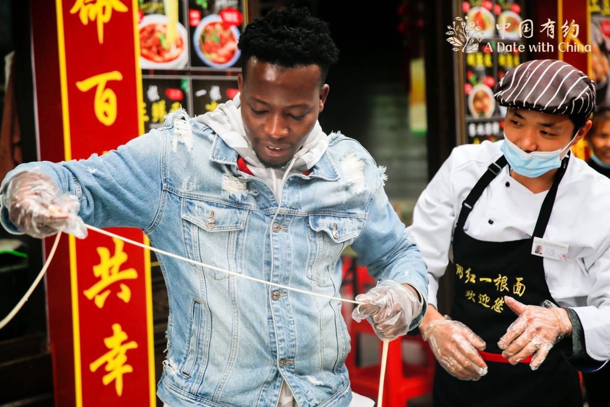 在面店门口,加纳籍网络自媒体人罗伯特·那尼(Robert Nani)也体验了一把扯面。