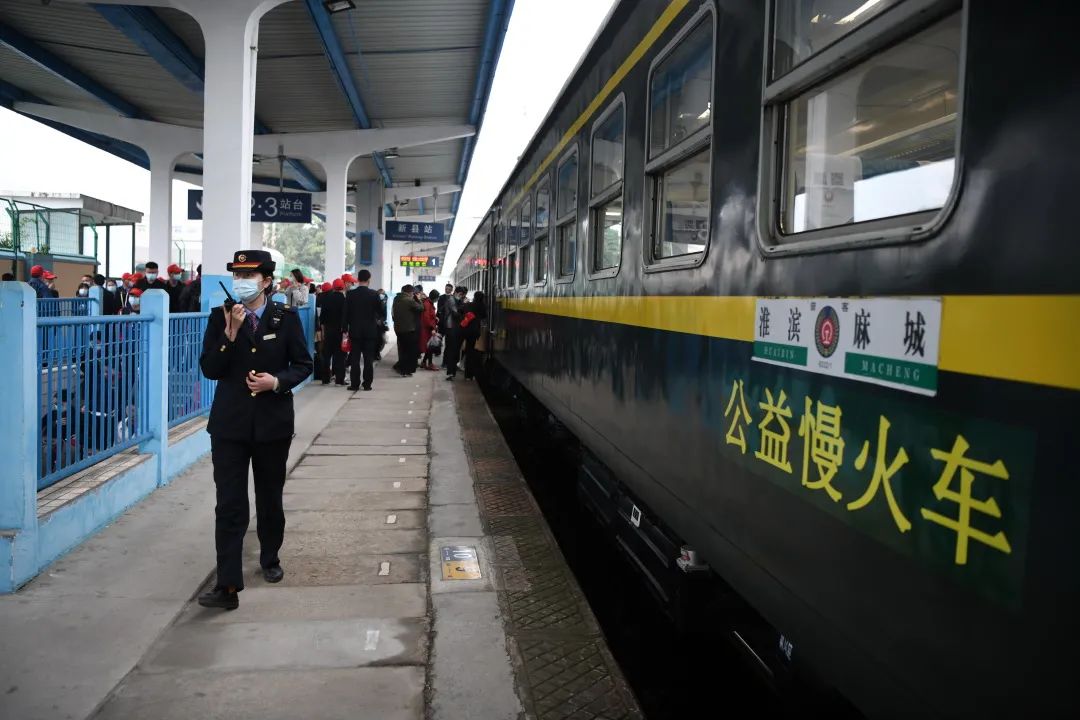 据列车员袁延艳介绍,这趟列车不但载着老区人民往返于麻城、淮滨之间探亲、上学、务工、做小生意,还为沿线铁路职工通勤提供便利。