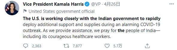在各方指责以及印度疫情持续加剧的情况下,直到25日,美国总统拜登和副总统哈里斯才开始正式回应,表示将向印度提供援助。