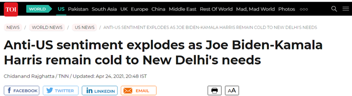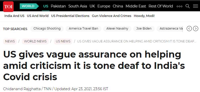 △《印度时报》23日刊发题为《因对印度新冠疫情充耳不闻遭受批评 美国作出含糊的口头承诺》的文章