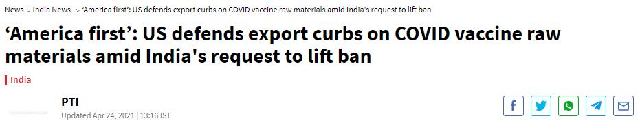 △《印度时报》24日再次刊文,称拜登政府对印度亟需新冠疫苗原材料的需求冷酷置之