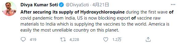 更有一名网友翻起了旧账,留言道:“在印度自己经受着严重的新冠疫情的时候,美国成功从印度获得了羟氯喹(此前被认为是治疗新冠肺炎的特效药,后世卫组织证实其几乎无效)。现在美国却还在禁止向印度提供疫苗原材料,显然美国已经变成了地球上最不值得信赖的国家。”
