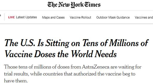△《纽约时报》3月11日报道称,美国正坐在全球亟需的数千万剂新冠疫苗之上
