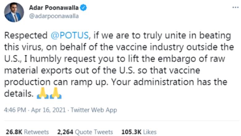 世界上最大的疫苗生产商——印度血清研究所首席执行官普纳瓦拉(Adar Poonawalla),4月16日在社交媒体上发文,“恳求”拜登政府解除对印度出口疫苗原材料的禁令,以便提高印度的疫苗产量。路透社此前也透露说,印美两国外长4月19日谈话时也提到了解除进口禁令一事。但是美国方面却一直没有对此进行回应。