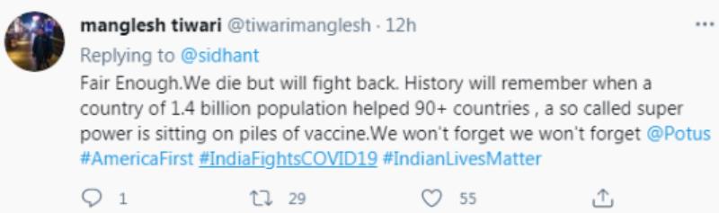 在普莱斯有关讲话的视频下,有一位印度网友这样留言说,“历史会记住,一个14亿人口的国家帮助了90多个国家,而一个所谓的超级大国却坐在成堆的疫苗上。我们不会忘记的,@美国总统”。