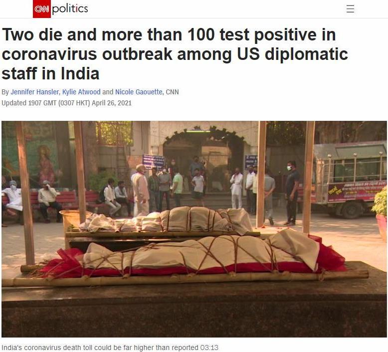 △CNN26日发表题为《印度新冠疫情更加严峻 美国驻印度外交人员中有2人死亡超过百人新冠检测呈阳性》