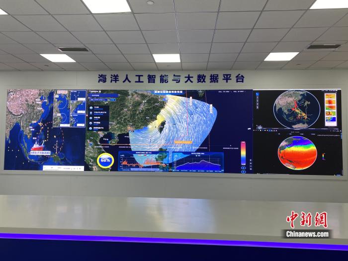 中科院海洋大科学研究中心海洋人工智能与大数据平台,图为沿海漫堤预警展示。彭宁铃 摄