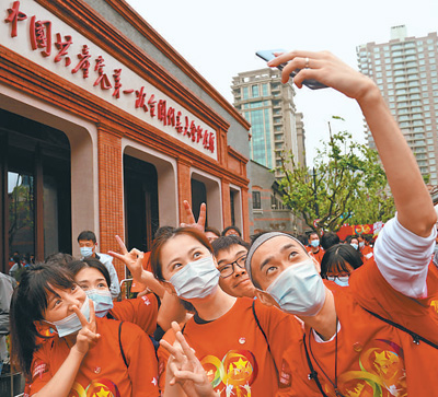 5月4日,在中共一大纪念馆国旗广场,参加五四主题集会的青年们在自拍合影。 |