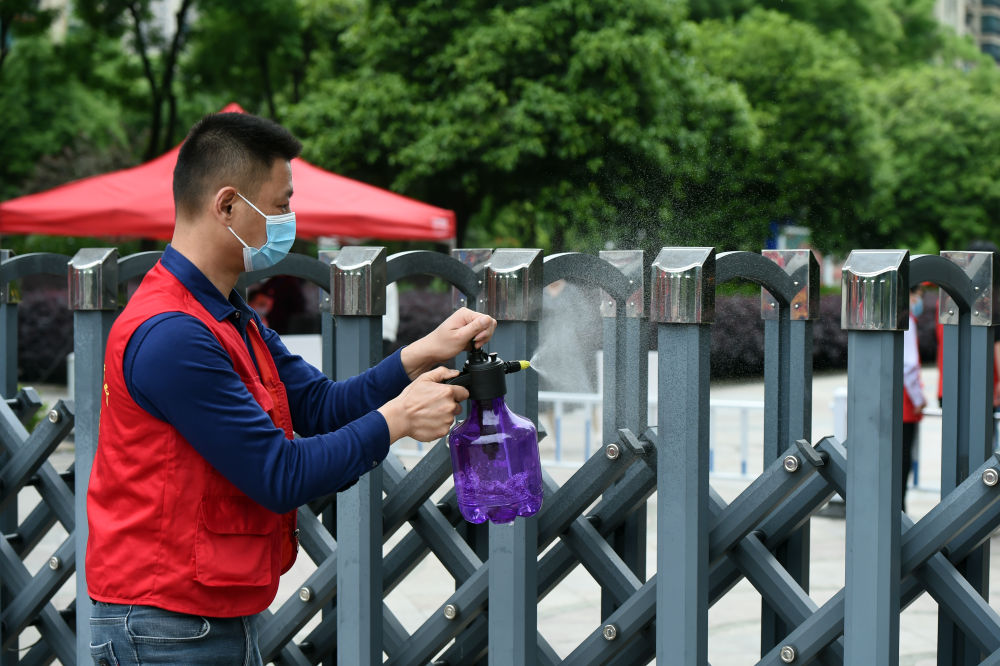 5月18日,工作人员在封闭管控的中风险区六安市恒大御景湾小区门口进行消毒。新华社记者 周牧 摄