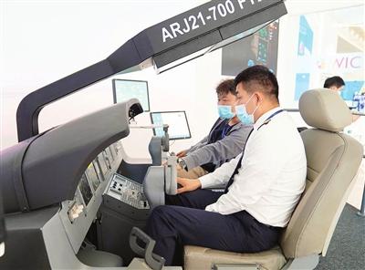 昨天,在记者探营智能科技展时,大厅内的一台飞行训练器颇有人气。这是国家级高新技术企业天津华翼蓝天科技股份有限公司带来的展品,记者也忍不住坐进半封闭式的“驾驶舱”模拟飞行体验。
