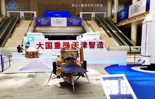 先来看看登录大厅,在这里您不仅能与人工智能的机器和场景进行互动,还能欣赏“津”彩的非遗展示,了解天津的历史传承,并看到人工智能揭榜优胜成果展等代表天津智能科技发展现状的展品。最引人注目的,莫过于一众“大国重器”——长征五号运载火箭1:10模型、嫦娥五号着陆器1:3模型、东方红一号卫星模型、中国空间站1:10模型等,都将向参观者展示我国航天事业的重大成就。