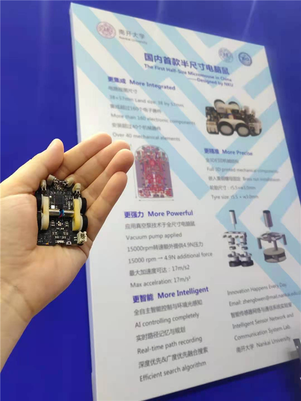 特别吸引观众眼球的还有一款仅有正常电脑鼠四分之一大小,拥有更高配置、更高集成、更高性能的迷宫机器人。南开大学电子信息与光学工程学院副院长孙桂玲教授介绍,学院科研团队在2017年打破技术壁垒,研发了国内首款半尺寸迷宫机器人。这款迷宫机器人的成功研发对国内半尺寸电脑鼠技术具有引领示范作用。