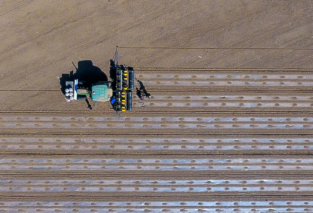 在新疆生产建设兵团第六师共青团农场的一片棉花地中,一名农机手正操纵装有北斗导航系统的多功能一体化无人驾驶精量播种机在田间播种(2019年4月19日摄,无人机照片)。新华社记者 王菲 摄