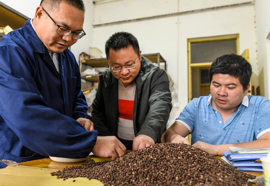 石河子农业科学研究院棉花研究所所长秦江鸿(左)和同事在研究所挑选准备做育种实验的棉花种子(2019年4月10日摄)。新华社记者 王菲 摄