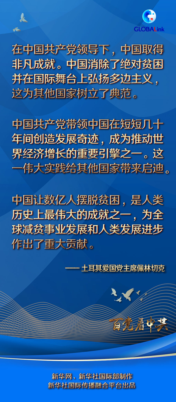 新华社安卡拉6月21日电 “在中国共产党领导下,中国取得非凡成就。中国消除了绝对贫困并在国际舞台上弘扬多边主义,这为其他国家树立了典范。”土耳其爱国党主席佩林切克日前在土耳其伊斯坦布尔接受新华社记者专访时如是说。