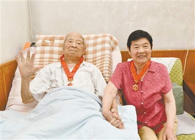 本报讯(记者宋文雅)6月30日上午,在河北省军区保定第三离职干部休养所,95岁的老人杨剑和85岁的爱人陈爱春满脸笑容地坐在家中,手上各捧着一枚金灿灿的纪念章,共同回忆着在党60多年来的时光岁月。