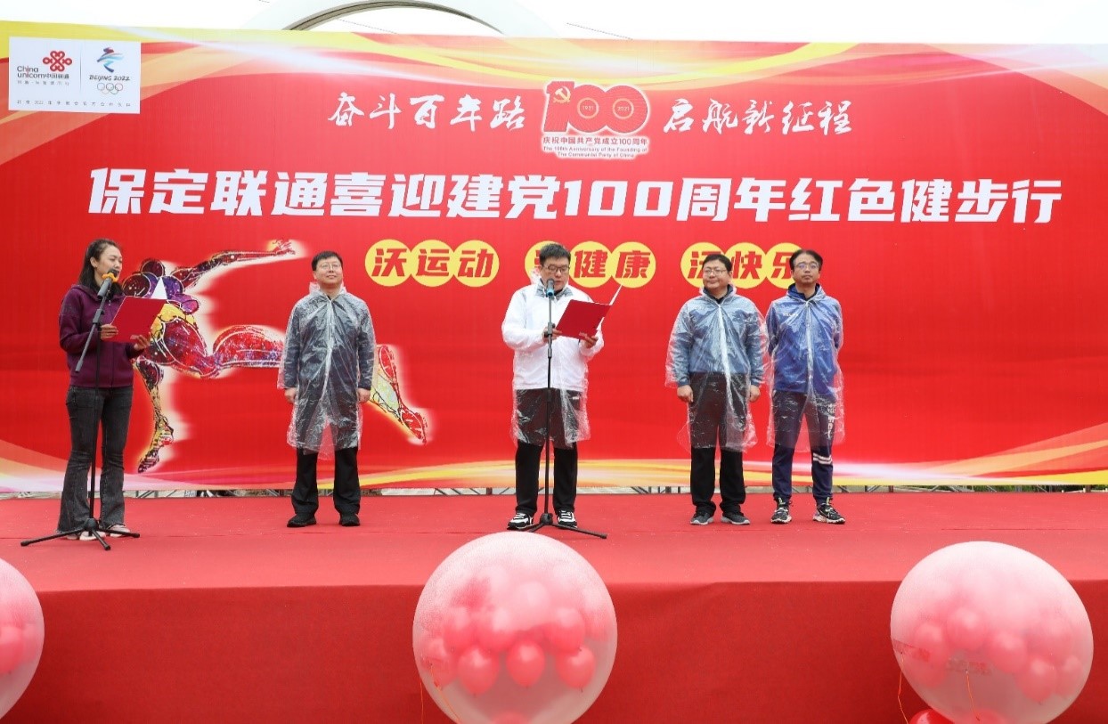 5月16日在顺平县享水溪,中国联通保定市分公司举行以“奋斗百年路 启航新征程”为主题的红色健步行活动,市分公司领导班子成员、34个分会代表队,近400名员工参加了活动。