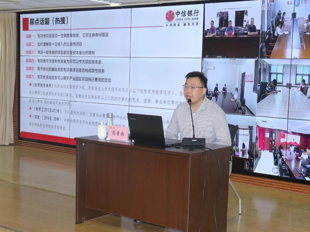 会上,中信银行总行机构客户部地方政府债业务首席专家葛鲁南围绕地方政府专项债券近期发行动态、地方政府专项债券近期政策解读、地方债何去何从、地方债重点领域解读、地方政府专项债如何规范使用、文旅专项债项目深度解读、中信银行专项债服务内容等相关知识进行授课。本次会议旨在通过对加快地方债申报及使用培训,使市县文广旅系统熟悉地方债申报流程和关程序规定,帮助文旅企业能够牢牢抓住以国内大循环为主体、国际国内“双循环”新发展格局、后疫情时代、数字技术时代文旅消费新升级等重大机遇,有效应对经济下行压力、扩大有效投资。