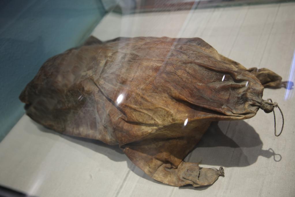 红军东征纪念馆内展陈的国家一级革命文物——羊皮浮筒。(红军东征纪念馆供图)