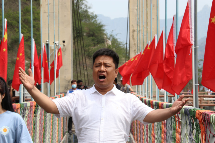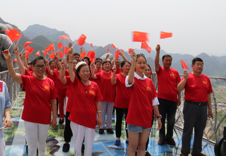 活动当天,30名歌手齐声高唱《没有共产党就没有新中国》《唱支山歌给党听》《在太行山上》,景区内上万名游客被优美嘹亮的歌声感染,情不自禁加入唱红歌队伍,用发自肺腑的深情表达对中国共产党的热爱。伴随着悠扬的古筝独奏,六位身着汉服的女孩在清泉山观景平台上出现,给游客们呈现了中华民族传统服饰之美,在宫商角徵羽中领略山水间广袖衣裾的魅力。