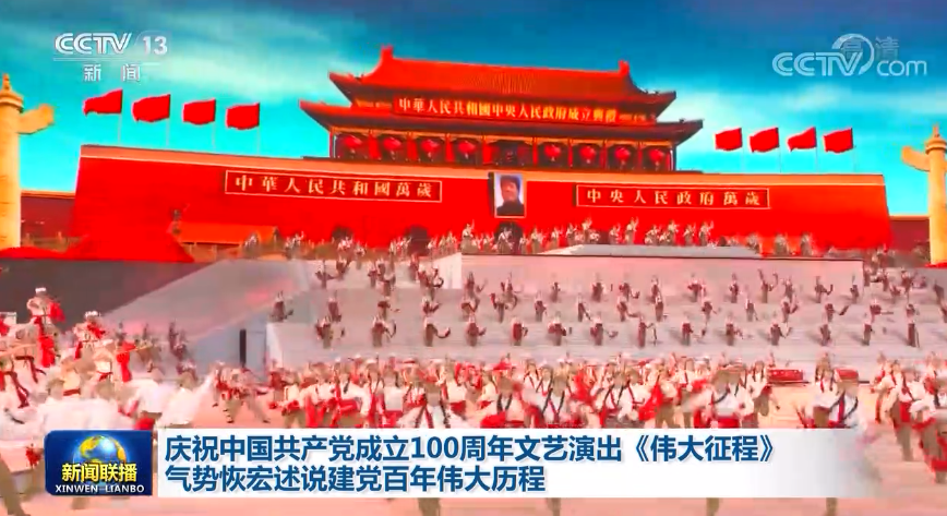庆祝中国共产党成立100周年文艺演出《伟大征程》以大型情景史诗形式呈现,新时代的艺术家们综合运用多种艺术手段和最新的演艺科技,生动展现了中国共产党百年来波澜壮阔的光辉历程,带领中国人民迈进新征程、奋进新时代的壮丽画卷。
