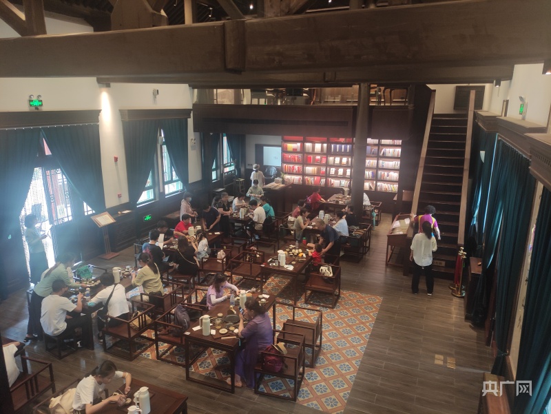 一楼的几张桌子和吧台都坐满了游客,每张桌子上都摆着一壶花茶,游客们一边品茶一边聊天,游客刘援说:“当年李大钊等人在这聊马克思主义,我们现在坐在这里聊天,也有那种文化氛围感。”
