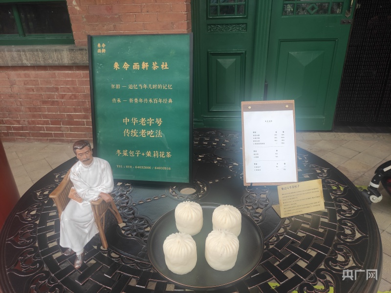 现在的来今雨轩门口摆了一张桌子,桌子上最显眼的就是冬菜包子模型,招牌上写着“冬菜包子+茉莉花茶,中华老字号,传统老吃法”。