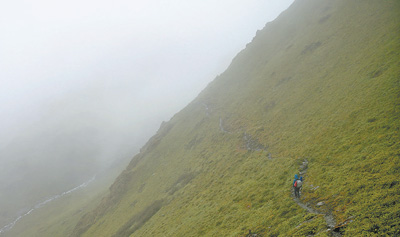 日子再苦,定期巡山是桑杰曲巴雷打不动的工作。一袋熟土豆,一把开山刀,就是巡山的全部装备。白天,用刀劈开密不透风的荆棘和灌木,在青苔泥泞的林间冒雨穿行;夜晚,在石缝树洞里躲避野兽。饿了吃点土豆,渴了掬一捧溪水,累了靠在树下休息。每次巡山前,桑杰曲巴总要叮嘱姐妹俩,两天就能回来,如果第三天还没回来,赶紧出山去曲桑报信。巡山路上,桑杰曲巴检查着自己以前楔下的木桩、挂上的国旗、刻下的文字。木桩如果被人拔掉了,他就重新楔上。国旗不见了,他就再次挂上。