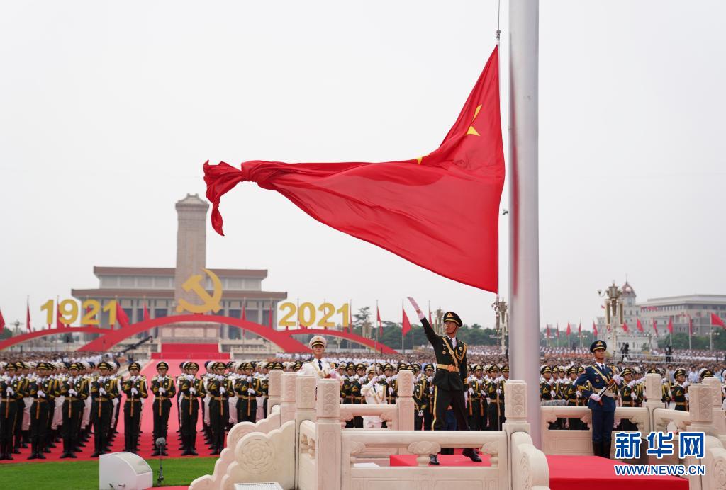 7月1日上午,庆祝中国共产党成立100周年大会在北京天安门广场隆重举行。这是升国旗仪式。新华社记者 申宏 摄