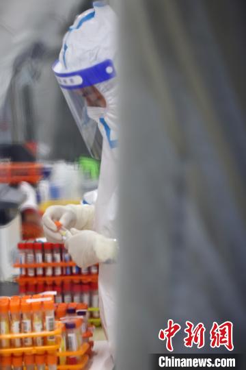 通过实验室的透明薄膜墙看到,工作人员在负压实验室内紧张工作,对源源不断送来的咽拭子样本进行操作。 泱波 摄