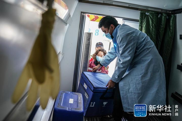 ↑7月22日,芦艳会在冷链车内将疫苗搬出,准备交付给四川甘孜州疾控中心。