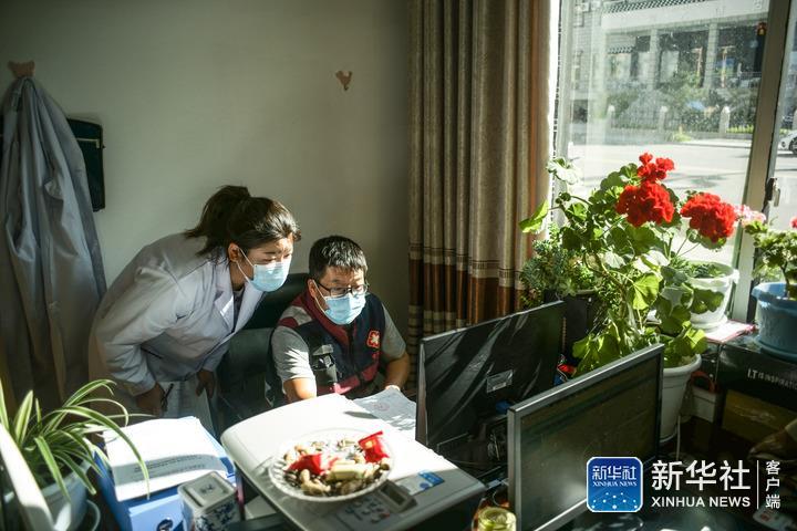 ↑7月23日,四川甘孜州疾控中心工作人员黄亮(右)在稻城县疾控中心与当地工作人员对接疫苗信息。