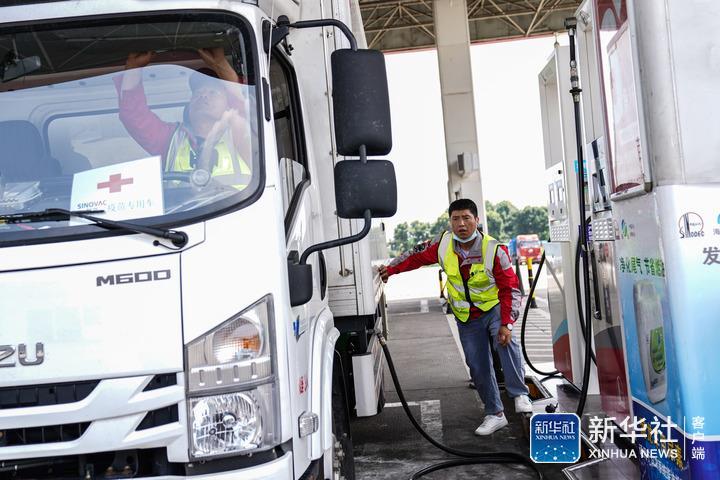 ↑7月22日,在运送疫苗途中,司机芦艳会在加油站给车加油。