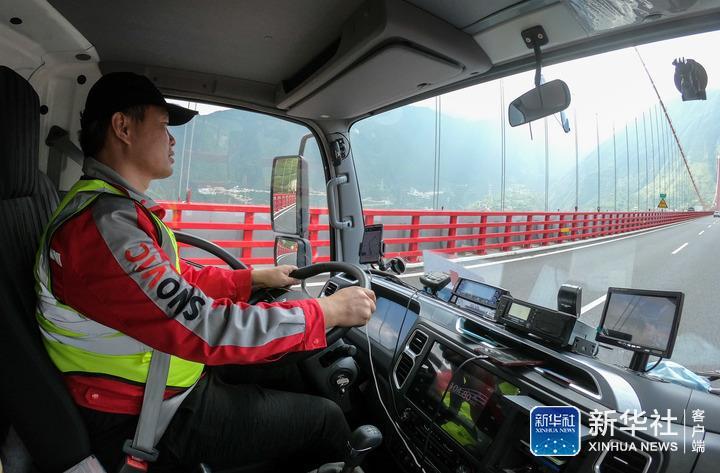 ↑7月22日,司机刘思驾驶运送疫苗的冷链车经过大渡河。