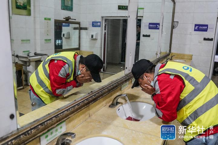 ↑7月20日深夜,在河北保定服务区休息时,司机芦艳会在卫生间洗脸。