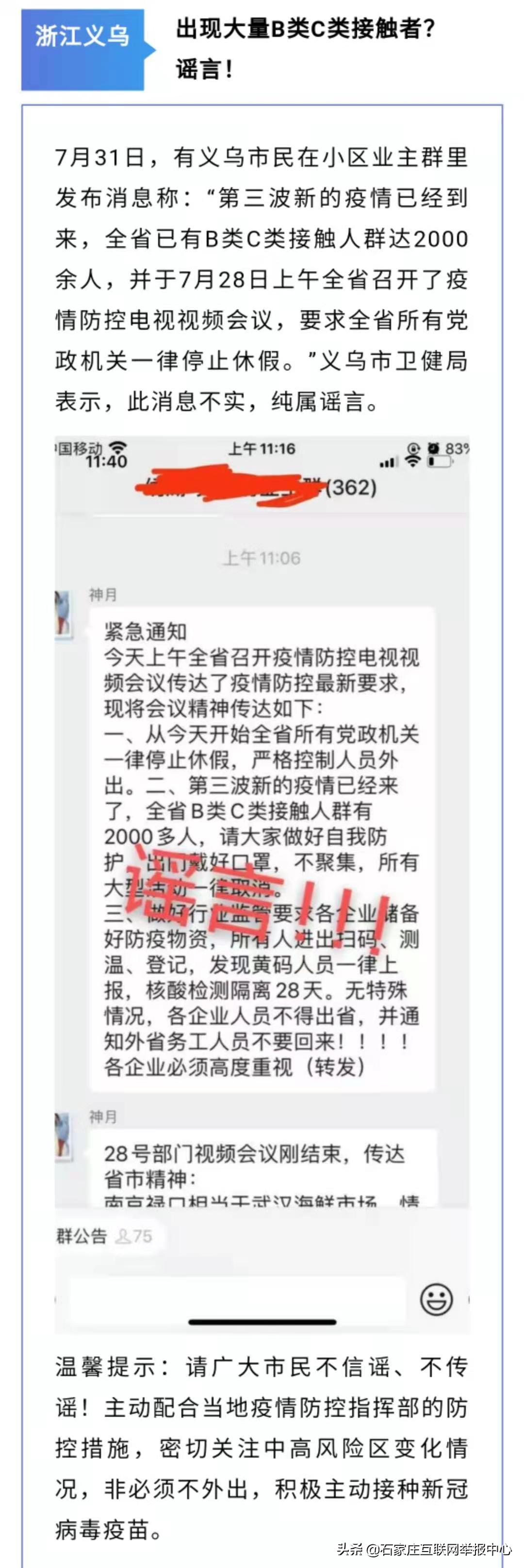 8月1日,多个微信群组和朋友圈流传“全省疫情防控会议最新要求”:全市所有党政机关一律停止休假、第三波疫情已经到来,全省B类C类接触人群有2000多人……”。经查证,网传通知内容不实,该谣言已被全国多地辟谣。