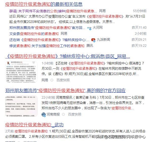8月1日,在多个群组和网民朋友圈中流传“疫情防控升级紧急通知”,称“石家庄市办公厅疫情防控办公室紧急通知:8月2日起全市恢复2020年初战时状态;所有小区恢复进出扫码;小区恢复一天三次消毒;所有居家隔离人员不能外出;红事缓办,白事简办,取消100人以上聚集活动;准备全员核酸……”。经石家庄互联网举报中心查证,石家庄市未发布相关内容文件,网传信息为谣言。经进一步分析,网传信息的发文单位、行文风格、发文方式等内容都存在常识性错误,石家庄市不存在“石家庄市办公厅”这样的机构,官方也不会通过微信发送通知,经检索,相关谣言已在全国多地传播,官方已辟谣。