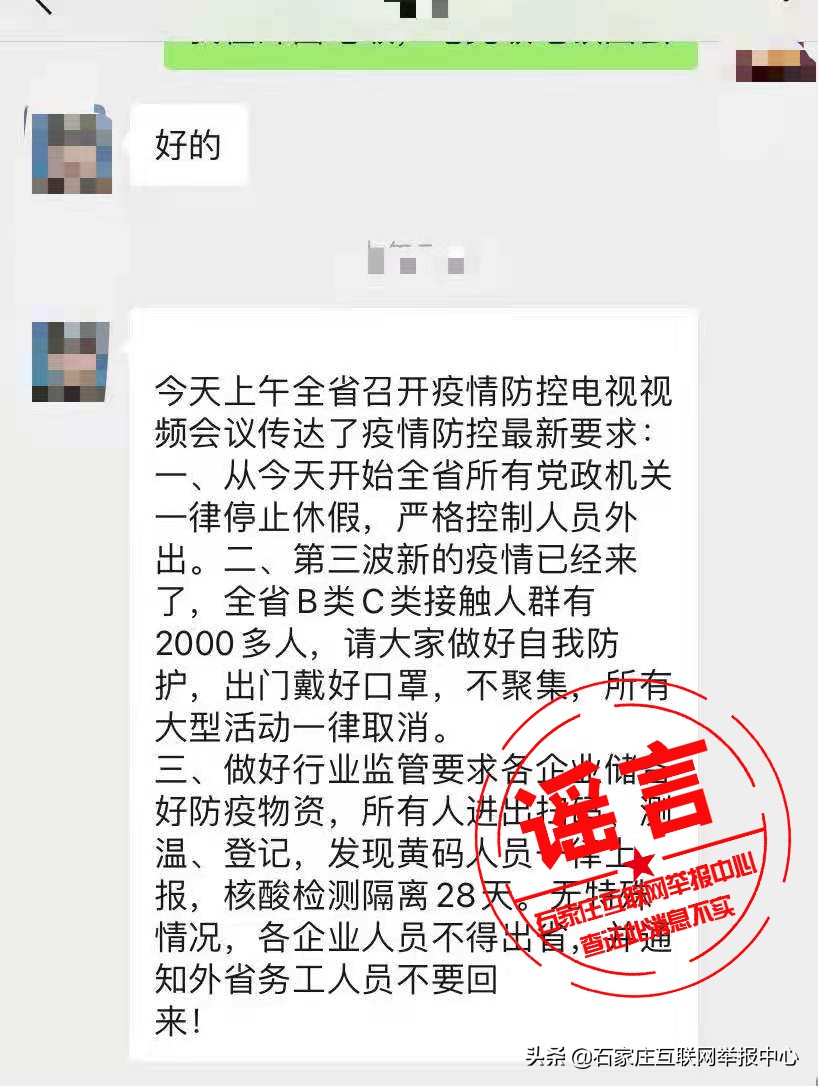 石家庄互联网举报中心提醒:网络不是法外之地,造谣传谣需承担法律责任。疫情防控人人有责,清朗空间共同维护,请广大网民通过官方渠道获取信息,切勿轻信小道信息,不造谣、不信谣、不传谣,积极配合各项防疫要求,加强个人防护,战胜病毒,我们一起努力!