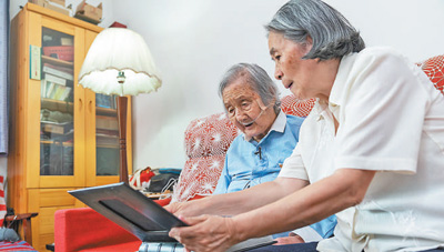 六月二十三日,在北京的家中,瞿独伊(左)和女儿李晓云向记者展示家人的相册。