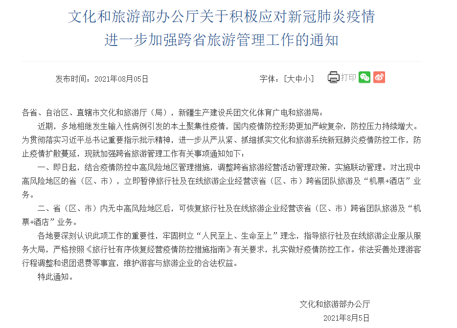 近期,多地相继发生输入性病例引发的本土聚集性疫情,国内疫情防控形势更加严峻复杂,防控压力持续增大。为进一步从严从紧、抓细抓实文化和旅游系统新冠肺炎疫情防控工作,防止疫情扩散蔓延,今日(5日),文化和旅游部办公厅发布通知,即日起,结合疫情防控中高风险地区管理措施,调整跨省旅游经营活动管理政策,实施联动管理。对出现中高风险地区的省(区、市),立即暂停旅行社及在线旅游企业经营该省(区、市)跨省团队旅游及“机票+酒店”业务。省(区、市)内无中高风险地区后,可恢复旅行社及在线旅游企业经营该省(区、市)跨省团队旅游及“机票+酒店”业务。