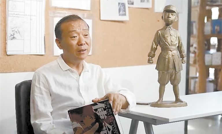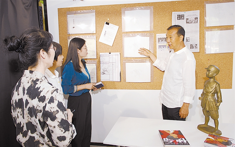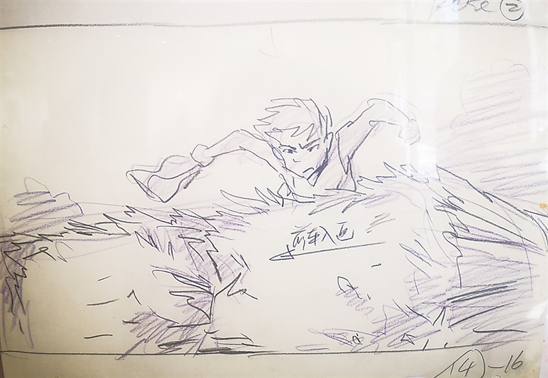 凡·公益艺术空间也可以看作是孙立军的工作室。如今,这里充满了动画电影《小兵张嘎》的创作回忆。墙上,挂着《小兵张嘎》情景设定、人物设定的脚本,几幅嘎子张开双臂奋力奔跑的手绘图,还排着序号。桌上,两座半米高的嘎子铜像,一个是双手叉腰,头顶荷叶的嘎小子,赤着上身,裤腿高高挽起;一个则是一身整齐军装的小战士,双手握拳,目光炯炯。那个坚毅勇敢倔强的嘎子如在眼前。