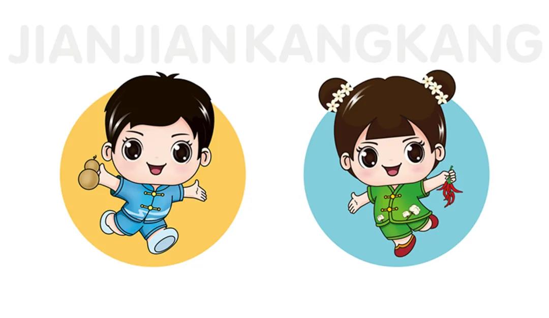 "健健"和"康康"身穿中式服装,体现武术文化元素,表达对中华优秀传统文化的传承弘扬;服饰颜色为蓝色、绿色,寓意良好生态环境。