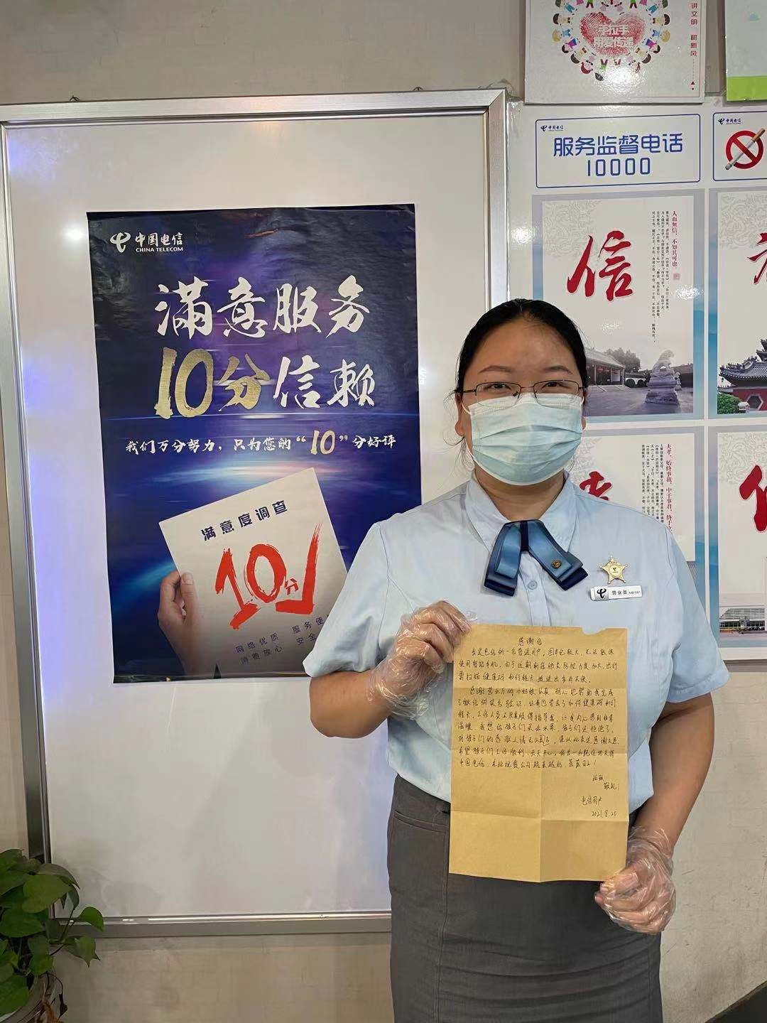 田晓璇细致周到的服务让老人很是感动。第二天,老人特意来到营业厅,把一封手写的感谢信交到田晓璇手中。田晓璇说:“没想到我的一个小举动,换来如此有‘温度’、有‘分量’的‘谢礼’,心里很温暖,今后工作更有干劲了。”