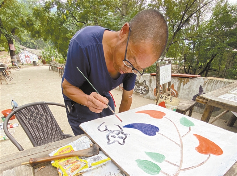“狗小”原名叫张拥军,是黑崖沟村人,50多岁,因为聋哑,村里没有多少人知道他的真实姓名,同村村民王金亮曾推荐他去学画画。作为公益画院的学员,“狗小”随着老师周合伟到猫村作画,从此绘画天赋被激发,大到整面墙的猫咪彩绘,就像村里桥上的“百猫图”,再到房门、窗户、石头上各式各样的猫咪图案,色彩艳丽,充满童趣,绝大多数都是“狗小”的创作。