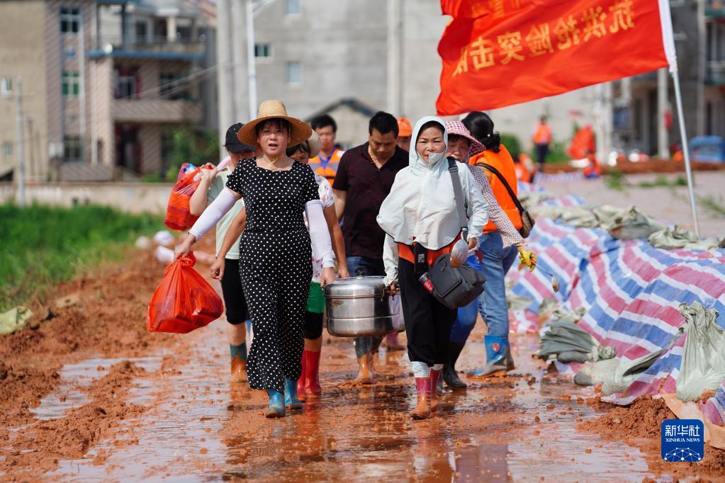 在江西省鄱阳县鄱阳镇江家岭村,由平均年龄超过五十岁的阿姨们组成的抗洪“阿姨团”给武警战士送来绿豆汤(2020年7月11日摄)。新华社记者 周密 摄
