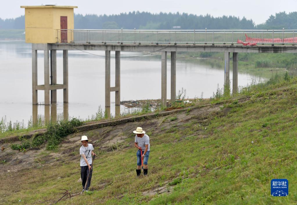 在江西省南昌市南昌县蒋巷镇赣江大堤,工作人员沿堤坝巡查排险(2021年5月25日摄)。新华社记者 彭昭之 摄