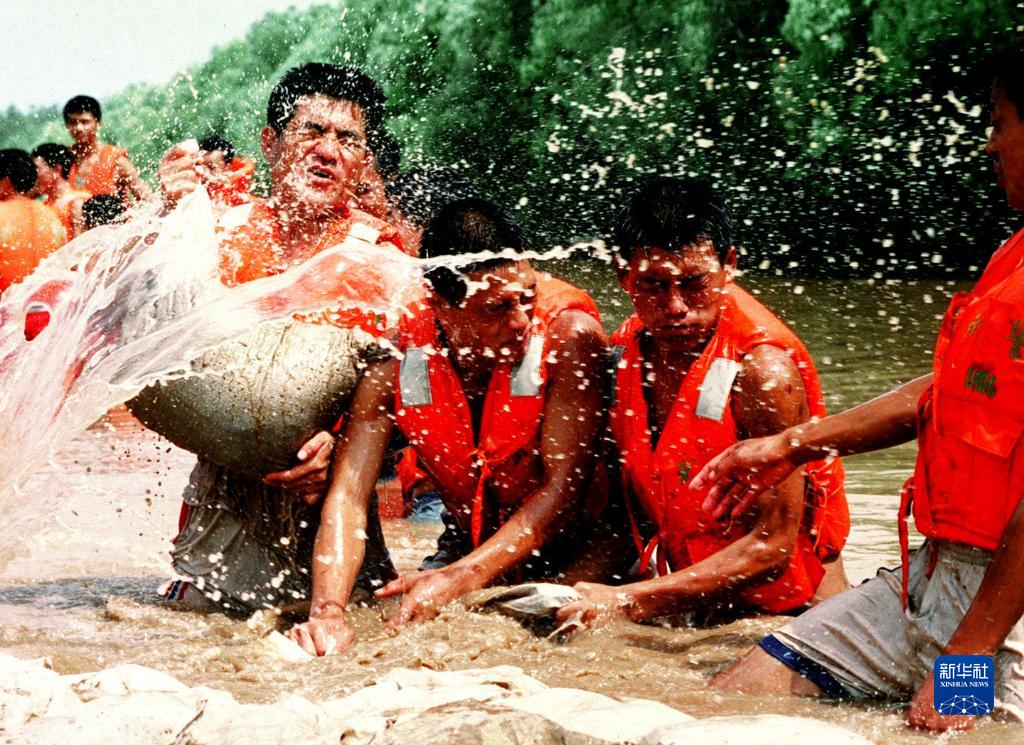 湖北石首久合垸乡团山河支堤出现“管涌”险情,解放军官兵立即奔赴险段,以血肉之躯挡住肆虐的洪水,减低洪水的冲击力,同时加固堤防(1998年8月11日摄)。新华社发(资料照片)
