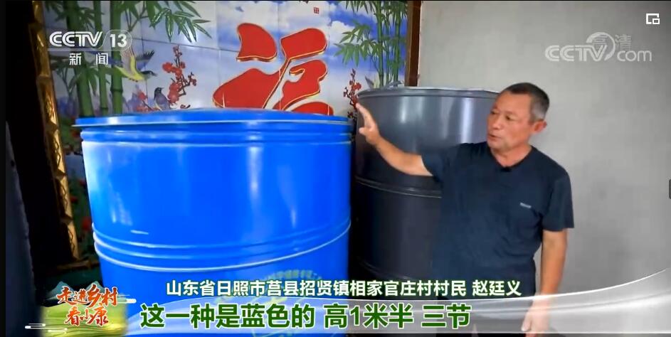 山东省日照市莒县招贤镇相家官庄村村民 赵廷义:我们农村流传着这么一句话就是“手里有粮,心里不慌”。这个粮囤有两种:一种是蓝色的,高1.5米,三节,每节50公分,直径有1.2米,装满能装2200斤粮食;这一种是灰色的,能装一千八九百斤粮食。现在我们村每户储粮达5000多斤,家家户户储备粮食让我们有了底气。