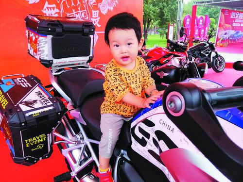 一位小观众对参展摩托车爱不释手。本报记者 苏兰生 摄